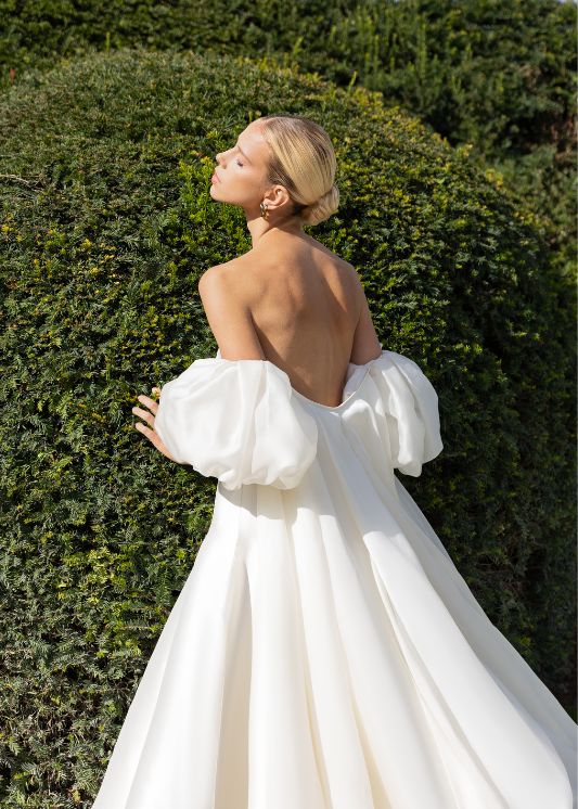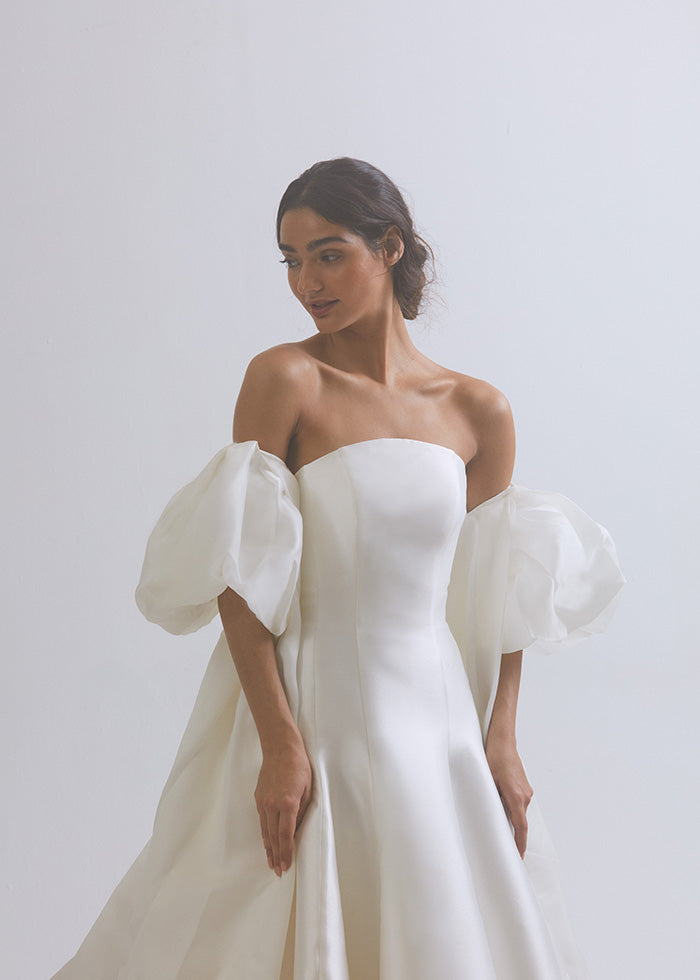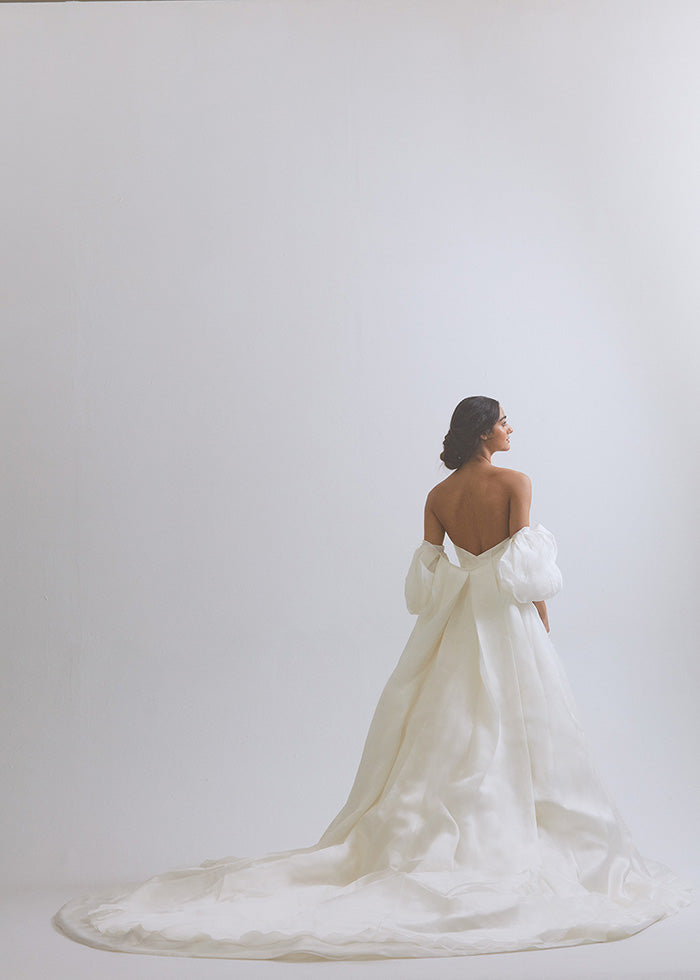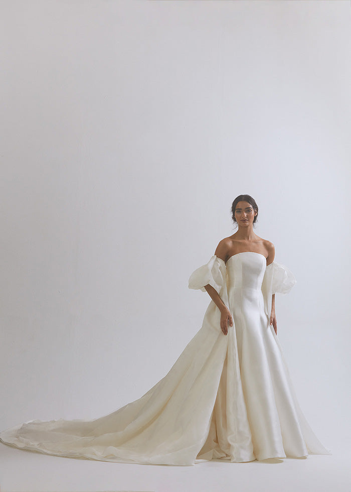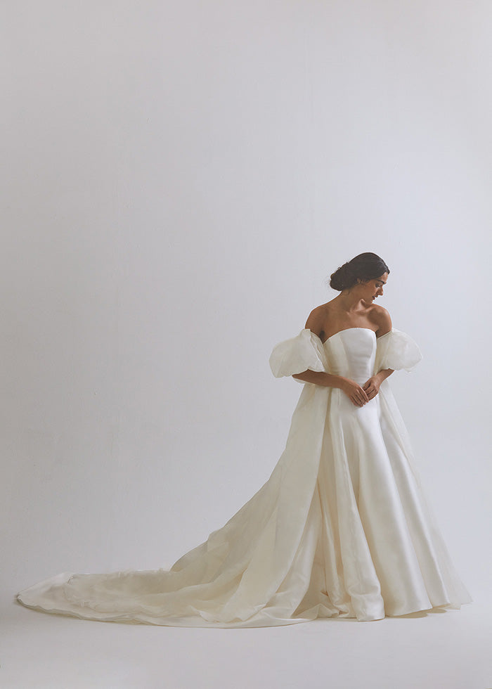 This exquisite MAËLLE cape is the ultimate choice for a luxuriously grand wedding. Crafted from Silk Gazar, its pleated billow sleeves and elongated royal train exude sophistication and elegance. Opt for that extra touch of sophistication in our luxe taffeta version as style 13123T. For a truly regal affair pair it with our VALENTINA gown, available as style 13110.