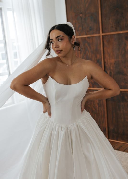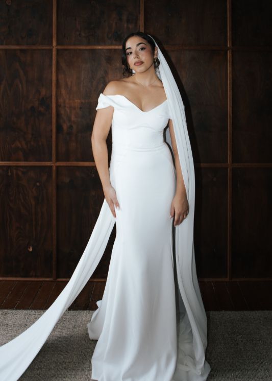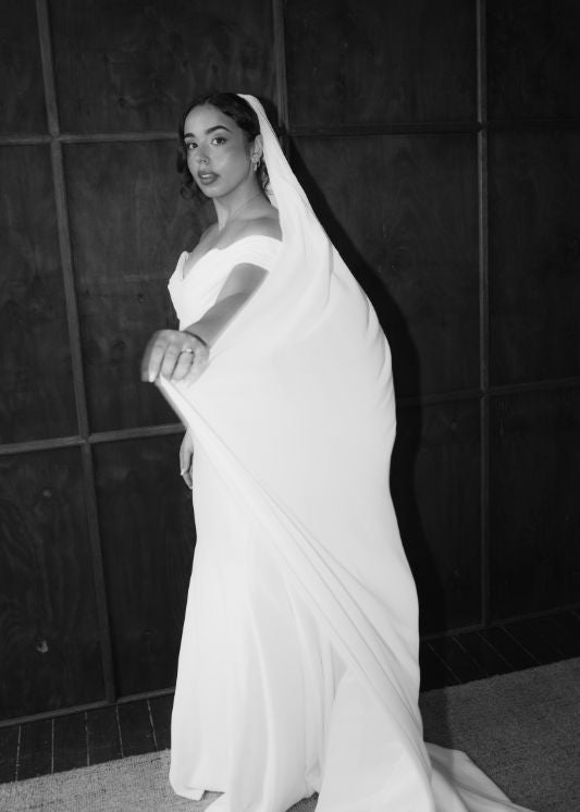 Perfect for the contemporary bride, this luxury cathedral veil transcends trends and captures light beautifully as you walk. Whether you choose premium silk for timeless opulence or our eco-conscious alternative for sustainable luxury, the Bella embodies our unwavering commitment to craftsmanship and conscious design.